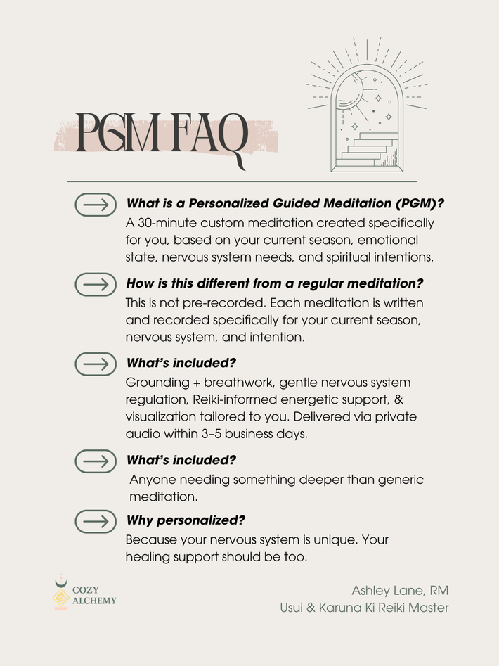 Founded by Reiki Master Practitioner Ashley Lane, Cozy Alchemy offers trauma-aware, nervous system–informed Reiki sessions and Personalized Guided Meditations designed to support the body’s natural ability to rest, repair, and restore. Here, science and spirituality meet, and healing is approached with gentleness and care.