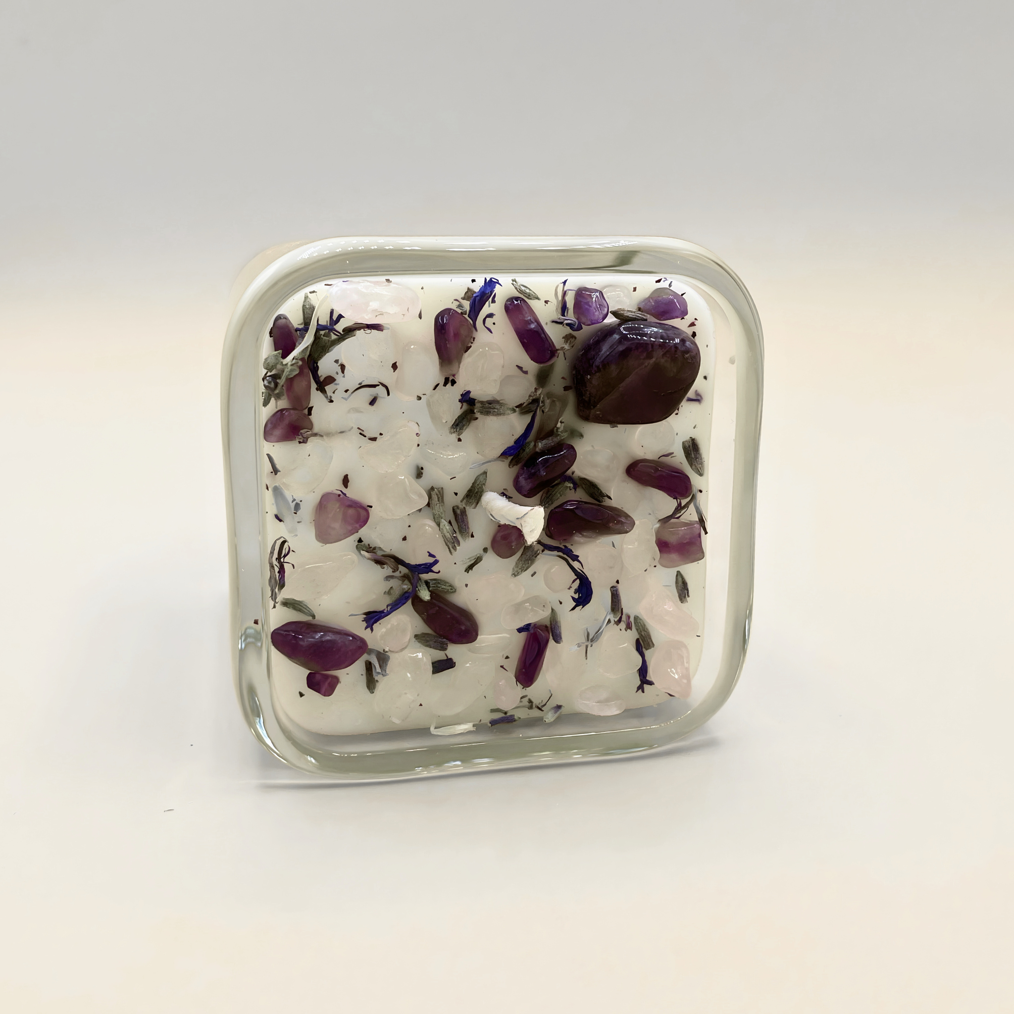 Crafted with 100% eco-soy wax and lead-free cotton wicks, each candle is topped with natural Rose Quartz and Amethyst crystals — both known for their calming, heart-soothing, and stress-relieving properties. Dried lavender herbs and a soft floral aroma round out this serene experience, making it the perfect companion for baths, meditation, or winding down at the end of a long day.
