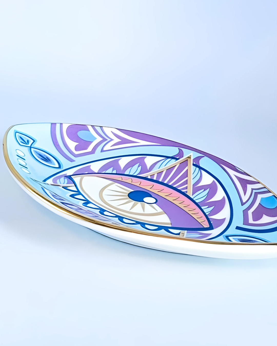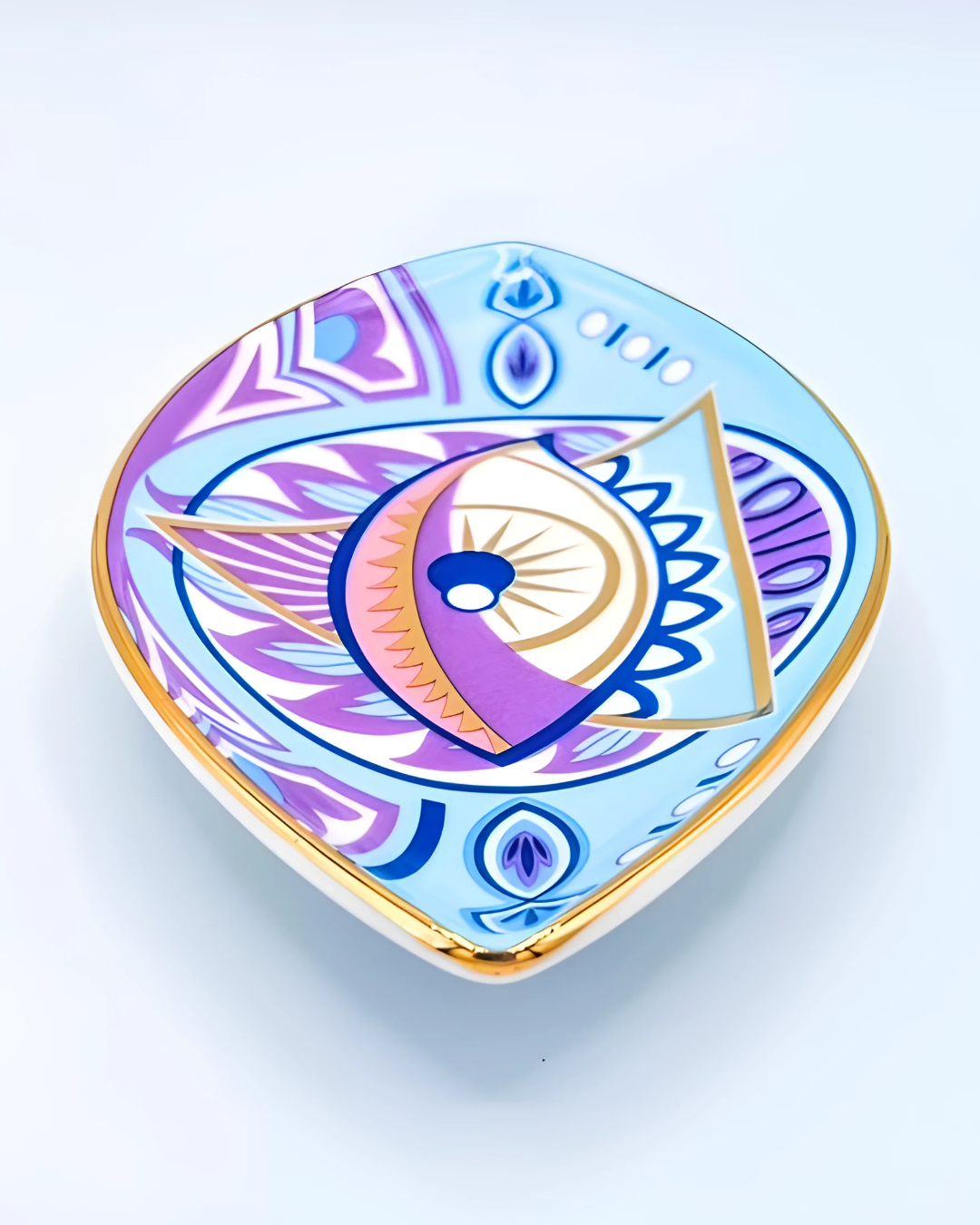 The Blue Paradise Ring Dish features premium ceramic craftsmanship, making it durable and elegant for daily use or display. The eye-shaped design, symbolizing protection and spiritual awareness, adds a meaningful touch to any space. Measuring 9cm x 15cm (3.5in x 5.9in), it’s the perfect size to hold rings, jewelry, keys, or small treasures.
