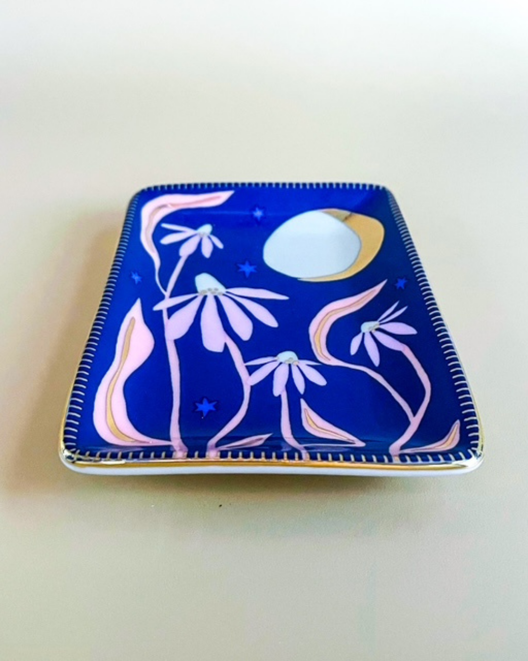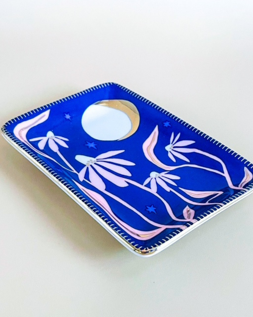 Each tray features delicate floral artwork, hand-painted with care and finished with a luxurious 10k gold trim for an effortlessly elegant look. Crafted from high-quality ceramic, it’s both durable and easy to clean — designed to bring beauty and intention to your everyday rituals.
